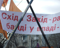 Они держали флаги своей организации, а также плакаты "Нет давлению "голубых" судьей", "Роспуску Верховной Рады - да", "Восток и Запад вместе, банде у власти нет", "Честный суд - честные выборы".