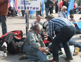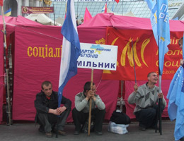 Прибывшие на Майдан (преимущественно это сторонники «Регионов») равнодушно расположились небольшими группами на теплом граните. Перед ними никто не выступает. По всему видно, что люди уже изрядно утомлены и не выражают особого желания вступать в политические баталии или словопрения, как в среде собственного политического лагеря, так и с помаранчевыми оппонентами.
