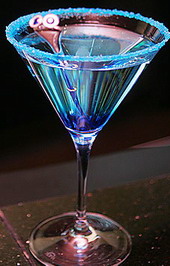 В его состав входят джин Бомбей Сапфир, сироп Блю Кюрасао и мартини. Край бокала украшен голубым сахаром и - внимание! - серебряной булавкой, на конце которой висят платиновые серьги с бриллиантами.