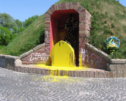 Неизвестные облили желтой краской беломраморную плиту с символической студенческой шинелью и словами украинского гимна, а также разлили краску в часовне. Также вандалы испохабили памятник антиукраинскими надписями