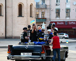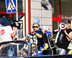 После пятиминутной автограф-сессии, «Чайка» переместилась на Михайловскую площадь. Сердючка из салона машины приветствовала прохожих и слала им воздушные поцелуи.