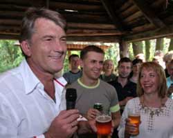 Спустя пять минут под аккомпанемент «Разом нас багато» в «Шинок» зашел Виктор Ющенко в компании первой леди. Президентская чета поздоровались с журналистами. «Садиться не буду, скажу тост стоя», - сказал президент, взяв с подноса бокал пива - «Цей тост свого часу дуже любив Вадим Петрович Гетьман. Він казав так: «Вип’ємо за трьох жінок – за Україну, за нашу матусю, і за жінок, яких ми кохаємо». Президент терпеливо салютовал бокалом каждому желающему. «Как вы узнали, что я хотела холодного пива?», - засмеялась Катерина Михайловна, которая тоже не отказалась от угощения. Не пил только Валерий Гелетей и его подопечные – ни грамма при исполнении.