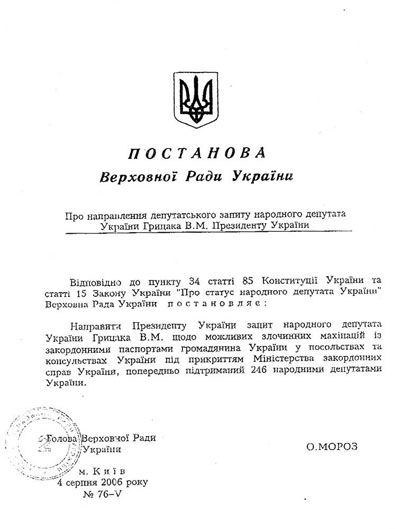 Уже после «отгрузки» паспортов в адрес МИДа данной сомнительной операцией заинтересовались народные депутаты Украины. Парламентарий Василий Грицак в одном из своих запросов по этому поводу писал: «...украинские дипломатические учреждения Республики Молдова только в 2005 г. получили 100 тыс. паспортов для выдачи гражданам Украины, которые работают в этой республике. Если считать, что каждый год имеет приблизительно 220 рабочих дней, то работники дипломатического учреждения Украины в Молдове должны выдавать 450 паспортов в день, или 57 паспортов в час, что соответствует 1 паспорту в минуту...» С сомнениями коллеги согласилось и подавляющее большинство депутатов ВР – коль сомнительно, что посольство Украины могло бы выдать гражданам Украины в Молдове такое количество паспортов, значит, речь может идти о какой-то махинации с украинскими паспортами. Ведь в прессу давно просачивалась информация, что в Молдове якобы украинский загранпаспорт на черном рынке может купить любой желающий – по цене от $500 до $5000 за документ. Если предположить, что на черный рынок украинские паспорта попадали каким-то образом по дипломатическим каналам, то с учетом общего количества паспортов, переданных в украинское посольство, речь может идти о многомиллионной афере. Имеют ли отношение к этому украинские официальные лица? Уже 04.08.06 г. ВР принимает Постановление № 76-V о направлении депутатского запроса на сей счет Президенту Украины.