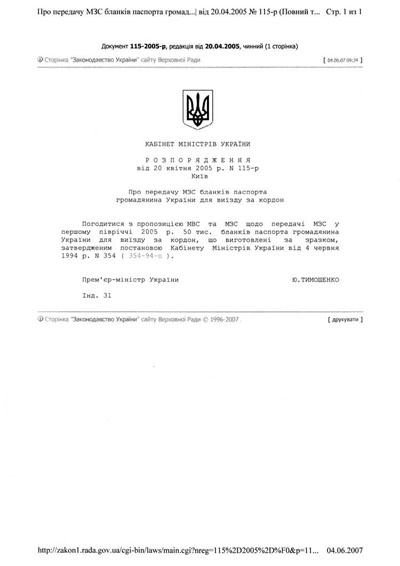 В 2005 г., согласно распоряжениям Кабмина (№ 115 и № 398-р), МВД передало МИДу 100 тыс. бланков загранпаспортов с вклеиваемой фотографией. Бланки были переданы в посольство Украины в Республике Молдова.