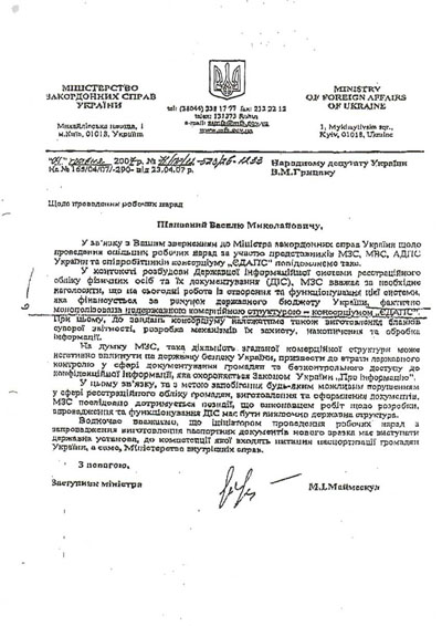 Тем не менее, этот факт не помешал Николаю Маймескулу от имени МИДа еще 4 мая 2007 г. подписать не менее одиозные письма на МВД (копия письма также направлена в Кабмин) и на имя одного из народных депутатов. В письмах Маймескул фактически напрямую клевещет на реализацию нового паспортного проекта и консорциум ЕДАПС. В частности консорциум называется им «негосударственной коммерческой структурой», которая де монополизировала работы по созданию и функционированию Государственной информационной системы регистрационного учета физических лиц и их документирования (ГИС). Из писем Маймескула следует, что консорциум будет заниматься «накоплением и обработкой информации». Честно говоря, даже как-то стыдно за некомпетентность чиновника высокого ранга, который представляет Украину на международной арене.