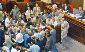 Выступая в вечернем телеэфире, Ющенко дал понять, что в Раде нашли свое пристанище не только «Иуды», но и «дельцы и менялы», преступающие все грани дозволенного и превращающие законодательный процесс в прибыльное предприятие. Единственное, что так манит участников партийных списков – почти неограниченная свобода действий под зонтиком «депутатской неприкосновенности». «Украине нужен парламент профессионалов, которые будут разрабатывать справедливые законы. Сейчас туда рвутся и те, кто от них прячется», - уверенным голосом декламировал президент. Поэтому он целиком и полностью поддерживает «усилия и обязательство блока «Наша Украина – Народная Самооборона» реализовать эту инициативу».