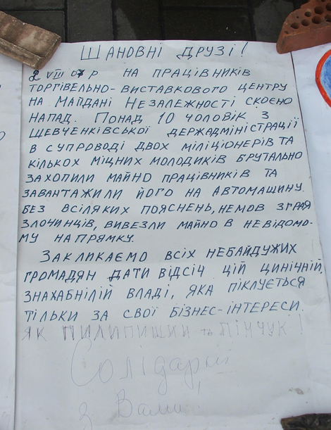 Напомним, что 2 августа Киевская городская государственная администрация (КГГА) запретила продавать на Майдане какие бы то ни было сувениры, музыкальные издания и печатные носители. В КГГА считают, что лотки портят внешний вид площади. Предприниматели отказались. По словам очевидцев, все их имущество было незаконно конфисковано сотрудниками Шевченковской райадминистрации и милицией.