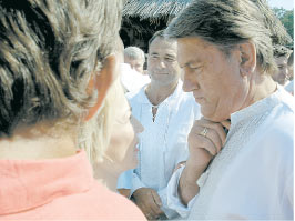 Ровно в 10.30, когда регионалка была на выходе с ярмарки, пришел Ющенко. Точнее, сначала появилась его охрана, человек 50, расчистила дорогу, а затем явился Виктор Андреевич. Началась давка. Все хотели поближе подойти к президенту. В этой жуткой толпе Богатырева и Ющенко оказались лицом к лицу. Мило поздоровались, Ющенко обнял коллегу, поцеловал и на этом разошлись.