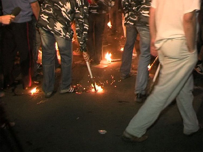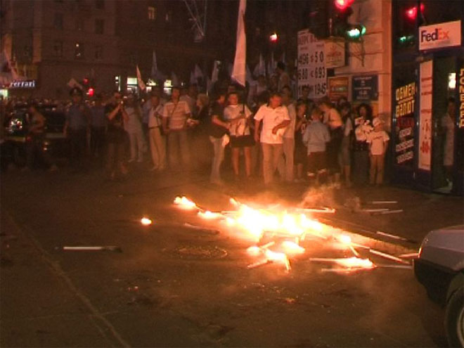 Прокричав несколько речевок «Юля это круто!», «Да здравствует Юля!» и др., они развернулись, выбросили факелы у обочины дороги, и пошли назад.