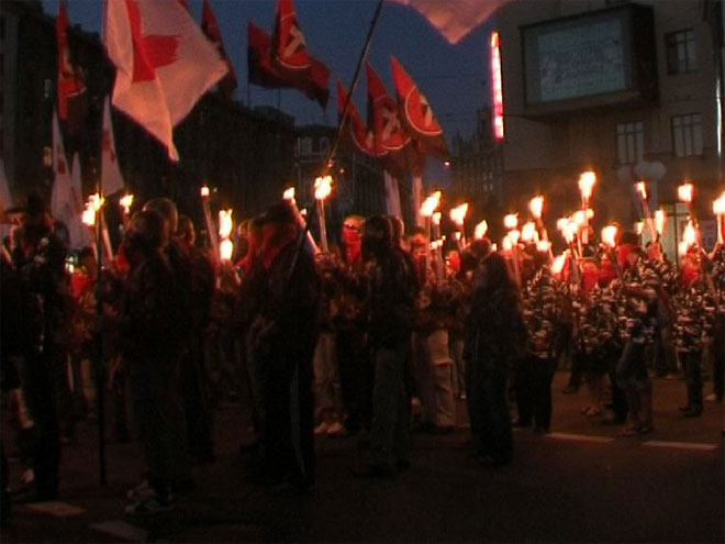 Спустя 40 минут после начала выступления Тимошенко, со стороны ул. Кооперативной в сторону площади начала двигаться группа людей в количестве порядка 100 человек в камуфляже с флагами БЮТ и Организации Украинских националистов (ОУН). Свернув у Главпочтамта, колонна наткнулась на строй милиции и остановилась (см. фото).