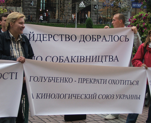 «Будучи ещё вице-премьер-министром Анатолий Голубченко (нынешний первый заместитель председателя Киевгорадминистрации - RUpor) пытался разорвать Союз на три организации. Только за последний период от него, президента Федерации охотничьего собаководства Украины и его «группы поддержки» союз получил ряд исковых заявлений в суд, ходатайств в Министерство юстиции про нарушение его конституционных прав в связи с непринятием его в члены организации и не соответствию устава КСУ нормам действующего законодательства», - рассказали пикетчики.