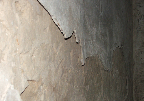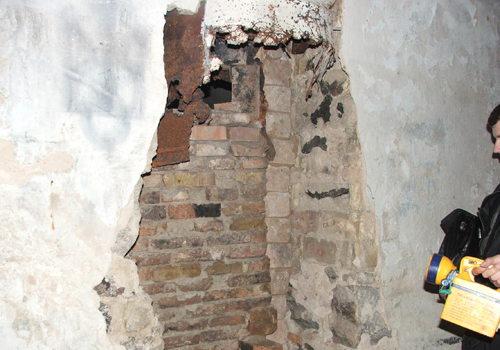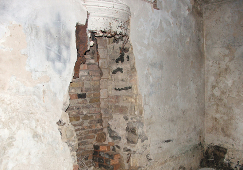Мы попали в два просторных зала с вычищенными до бела стенами (см. фото). Они еще сохранили следы инструмента. Комнаты полностью лишились верхнего слоя штукатурки толщиною в 20 см.