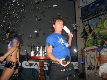 Вечеринке поддали жару и девушки с логотипом генерального спонсора мероприятия, нанесенным на обнаженную грудь. Их эротичные ужимки и сексуальная стрельба глазами не оставили сомнений – это самый яркий рекламный продукт ночи.