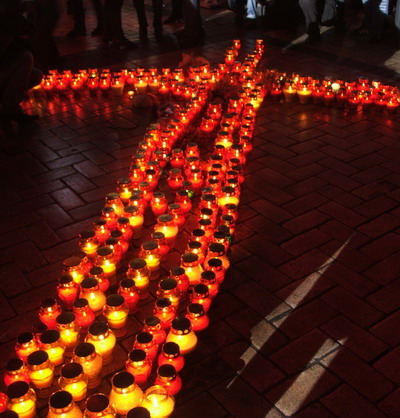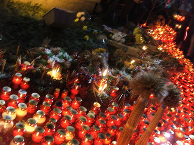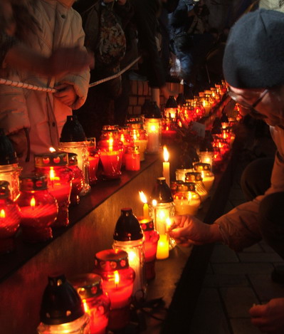 Здесь же были делегации со всех областей Украины. Приходили целыми семьями – с маленькими детьми и престарелыми родителями, с друзьями и в одиночку. Несли цветы, колоски и хлеб. Молчали и крестились. Выстраивали целые колонны свечей и забирали несли памятный огонь домой, чтобы потом поставить его на подоконник возле окна. В этот день можно было увидеть тысячи огоньков в тысячах домов.