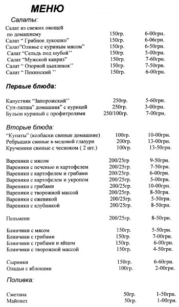 Интерьер помещения выдержан в народном стиле. Любезные официантки одеты в украинские костюмы. На стенах висят старинные иконы, картины. В зале могут поесть одновременно 60 человек. Подают здесь в основном очень калорийные блюда: вареники с разными начинками, салаты и булочки на любой вкус. Распивать спиртные напитки и курить – запрещено.