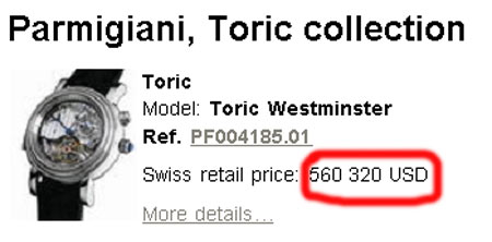 Простые часы Parmigiani Toric Westminster, как у господина Ахметова, стоят $536 910. Но надо учитывать, что часы украинского олигарха полностью украшены драгоценными камнями, а это существенно поднимает цену.