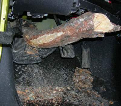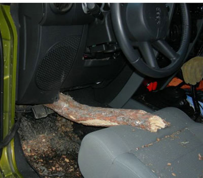 В «неравном поединке» автомобиля и дерева победу одержало дерево. Водителю джипа сильно повезло, что он не лишился мужского достоинства. От коварной сосновой ветки до мужчины оставались считанные сантиметры, передает Trinixy.