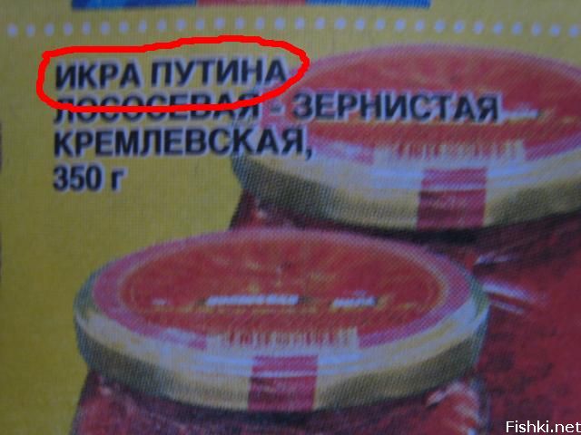 Банка с лососевой икрой весом 350 с этикеткой, на которой написано: «ИКРА ПУТИНА ЛОСОСЕВАЯ-ЗЕРНИСТАЯ КРЕ