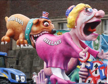 Сегодня в Германии безумный понедельник (Rosenmontag). В этот день через весь город двигаются колонны ряженных и разрисованных клоунов. Главными героями карикатурных кукол, выполненных весьма точно и достаточно злобно, чаще всего становятся ведущие политики. Сегодня по главной улице Дюссельдорфа проехали карикатурные фигуры американских политиков Хиллари Клинтон и Барак Обама, которые ведут ожесточенную борьбу за кресло президента.