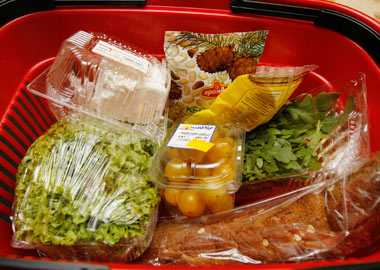 – Для салата нужны только натуральные ингредиенты, – Игорь учит Алену премудростям здорового питания. – Возьмем салат «Лоло Биондо» (23,92 грн. за 300 г), салат «Рукола» (14,01 грн. за 90 г), мелкие кедровые орешки (16 грн. за 70 г) желтые помидорчики (13 грн. за 250 г), желтый перчик (12,99 грн. за три штуки) и сыр «Маздамер» (11,60 грн. за 200 г). Все это посыпаем тертым «Пармезаном» (15,88 грн. за 100 г) и зальем оливковым маслом (22,78 грн. за 200 г). А на закуску – багет с зернышками (6,78 грн.) В итоге вышло – 136,96 грн.!
