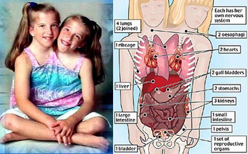 У них две общие ноги и руки. У них два сердца, две пары легких, но только одна печень, мочевой пузырь, грудная клетка и таз. Каждая контролирует свою сторону тела и ничего не чувствует с другой.