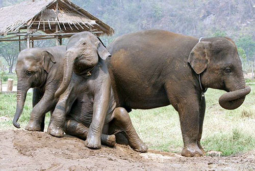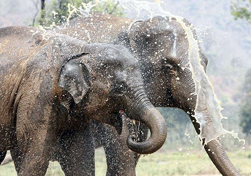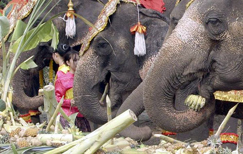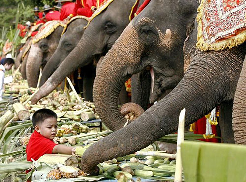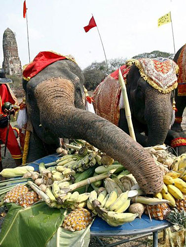 69 слонов из лагеря древнего города Айютайя, Таиланд, принимают участие в церемонии кормления.