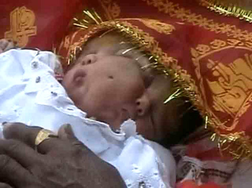 Толпы верующих шагают в небольшую индийскую деревушку Сайни, чтобы своими глазами посмотреть на двуликую малышку. Ведь индусы верят, что четырехглазое создание - воплощение божества.