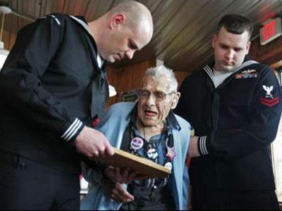 Юбиляра прибыли поздравить от имени флота, где он служил в годы Второй мировой войны, офицеры Лейф Дентон и Крис Таберт.