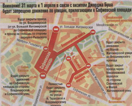 Однако для обычных киевлян визит столь высокой персоны на протяжении всего завтрашнего дня будет сопряжен с определенными неудобствами. По ходу движения президентского кортежа его будут сопровождать сотни милиционеров и американских агентов, а также не намного меньшее число антинатовских активистов оппозиционных партий. И, что самое неприятное, полностью будут перекрыты все подступы к маршруту следования Буша.