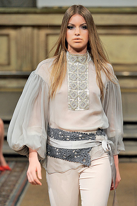 Чтобы удовлетворить прихотливые вкусы итальянской публики, Айна использовала для своих нарядов материалы из серебра, с золотым напылением и украшения с ценными камнями. Но самым пикантным аксессуаром коллекции стали декоративные украинские трубки из Галичины XVIII века. Именно они подчеркивали общий дух коллекции – украинский народный костюм XVII-XX веков. Украина от Гассе – это времена гетманщины в стиле барокко – орнаменты из бисера, мех, вышивка, плетение. На показе также присутствовали редакторы итальянских и французских журналов мод. По завершению Гассе аплодировали стоя.