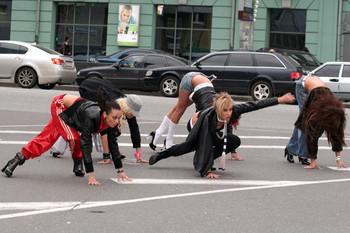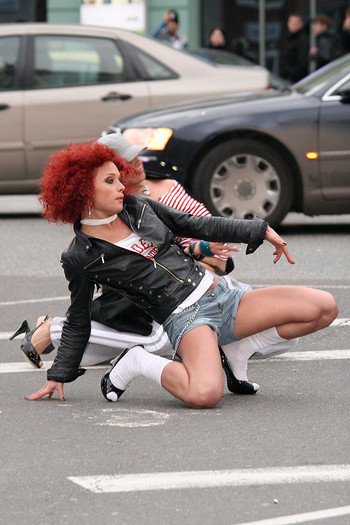 Несмотря на пасмурную погоду с "висящим" над головой дождем, из-за которого съемки переносились несколько раз, небо в этот раз решило смилостивиться и ниспослало хотя и не солнечную, но, по крайней мере, и не дождливую погоду. Было зябко, но девушки согревались своими горячими откровенными танцами, чем удивляли проезжающих.