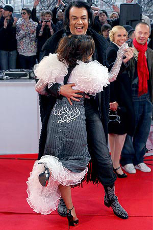 Особенное внимание московских модниц привлекло платье Каролины, которое она надела на вечеринку MTV Movie Awards: замысловатый наряд в черно-серых тонах с пышной кружевной отделкой поразил не фасоном, а надписью на попе у Каролины: Shady Lady (название конкурсной песни Лорак, которое переводится как «таинственная леди»). А чтобы всем было хорошо видно, Киркоров как следует покрутил певицу на красной ковровой дорожке.