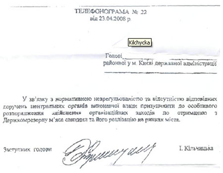 Кроме того, правительство сообщило о том, что существует прямое запрещение заместителя председателя КМДА Ирены Кильчицкой руководителям городских государственных администраций принимать мясо из резерва (см. ниже). Городские администрации демонстрируют сознательное нежелание снижать цены на продукты в канун праздников. Это демонстративная и циничная блокировка реализации программы правительства по остановке инфляции», – заявил в тот день первый вице-премьер-министр Александр Турчинов.