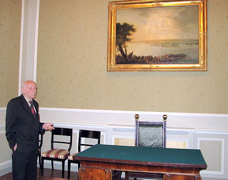 В то же время в кабинете вывешенные картины с сюжетами, связанными с фигурой Екатерины II. На одной из картин изображена русская императрица, которая плывет в лодке по Днепру. На другом полотне - феерверк в честь Екатерины на Тарасовой горе в Каневе.