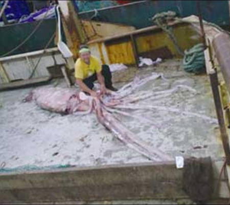 Кальмара выловили на юго-восточном побережье страны на глубине 500 метров. Для того чтобы тело гигантского моллюска вытащить на палубу, потребовались усилия десяти рыбаков.