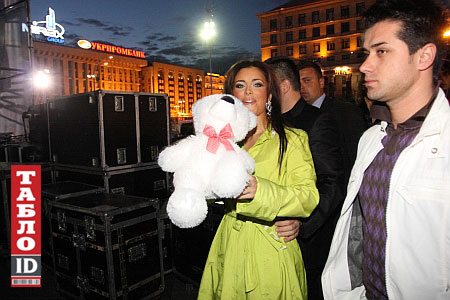 К лучшей подруге забежала и серебряный призер "Евровидения-2008" Ани Лорак. Ей сразу подарили мишку, который прекрасно подходил к куртке жениха Лорак, Мурата (справа)