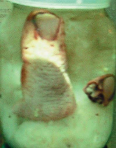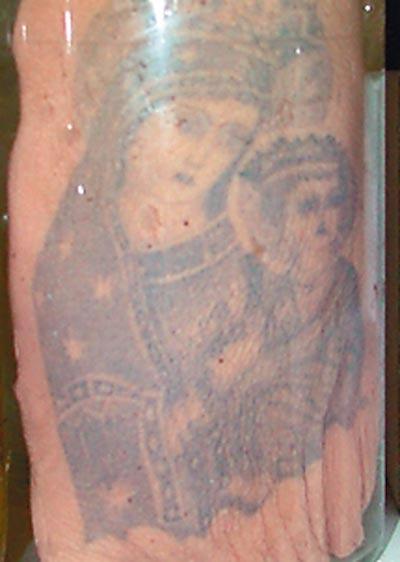 Среди экспонатов фрагмент кожи с татуировкой размером 20 на 16 сантиметров в банке с формалином.. Следуя моде, 20-летний молодой человек наколол себе Богородицу с младенцем. Татуировку из глупого озорства попросил сделать на внутренней стороне бедра, почти в паху – якобы, «для привлечения женского внимания». В больницу он попал спустя несколько месяцев после того, как наколол рисунок. Говорил, что сначала все было хорошо, ничего не беспокоило. А потом вдруг нога неожиданно воспалилась - сначала палец, потом выше. Началась гангрена, и конечность пришлось ампутировать…
