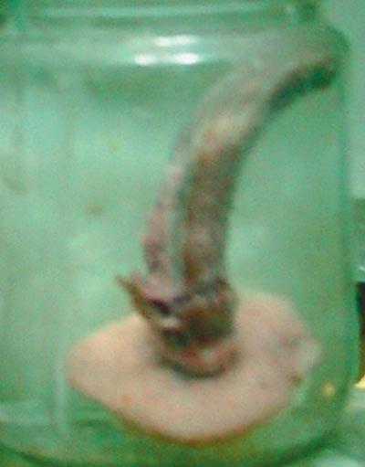 Этот удивительный экспонат - рог, выросший на черепе человека…Это последствия воровства… Судя по истории болезни, 45-летний мужчина залез ночью в чужой дом, где и был обнаружен возвратившимся хозяином. Хозяин как следует шарахнул вора палкой по затылку. Жулику удалось убежать, но через некоторое время он вынужден был обратиться в больницу, потому что на затылке у него вырос рог, очень плотный, из соединительной ткани, пропитанной кератином. Длина отростка 7 сантиметров, диаметр - 1,5. Рог вырос как раз на месте травмы, полученной при попытке кражи…