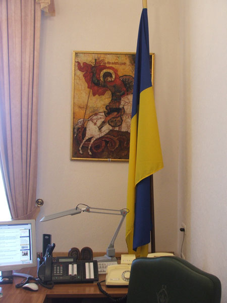 Как и у Пукшина, интерьер заместителя председателя Секретариата, курирующего вопросы культурной политики, Юрия Богуцкого украшен произведениями иконописи. С правой стороны от его стола находится огромное изображение Георгия Победоносца. «Я ведь Юрий, то есть Георгий. Поэтому я всю жизнь и коллекционирую иконы Георгия Победоносца. Они все хранятся у меня дома», - пояснил он присутствующим.