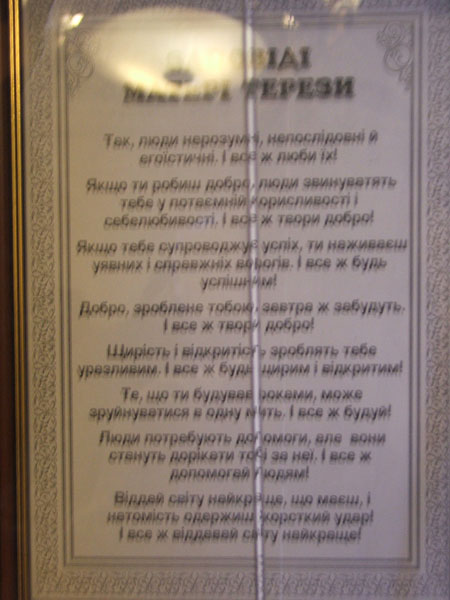 Но, пожалуй, самым религиозным старался быть Роман Бессмертный. Вместо иконописи на столе в его офисе мы увидели Библию на родном языке и тексты молитв, спрятанные в аккуратные стеклянные рамки – молитва о святости народа, молитва о добрых руководителях и рядом с ними католические заповеди Матери Терезы.