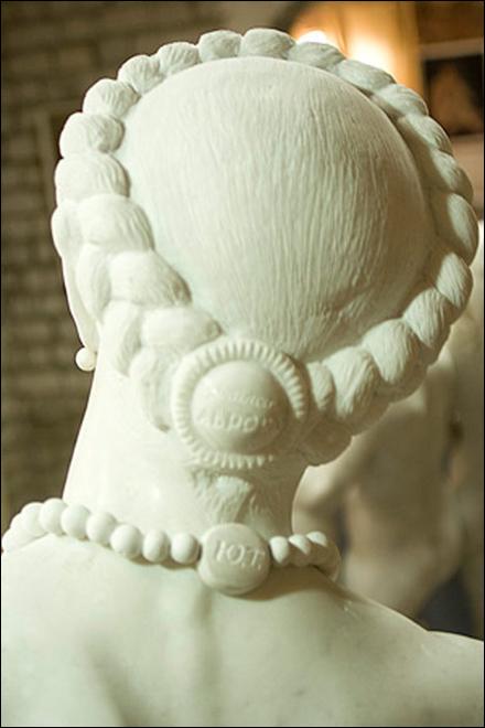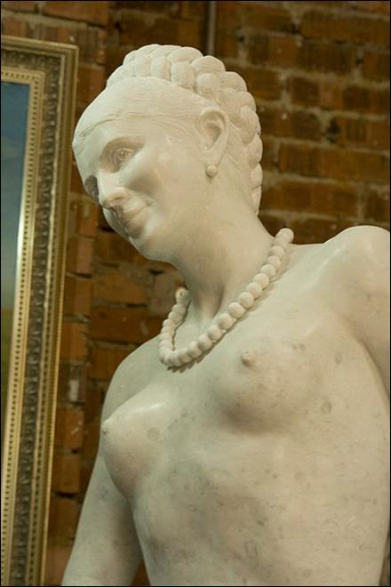 Лицо получившегося творенья мало напоминает оригинал, поэтому «король мрамора» на всякий случай снабдил «Аврору» знаменитой косой «бубликом» и инициалами «Ю. Т.» на застежке «жемчужных» бус.