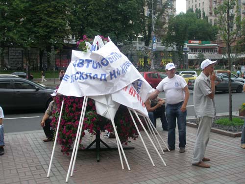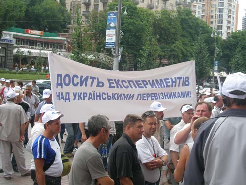 Представители ассоциации, в частности, держат плакаты с требованиями: «Равные условия украинским и иностранным перевозчикам», «Хватит экспериментов над украинскими перевозчиками», «Украина – транзитное государство, а не княжество Черновецкого».