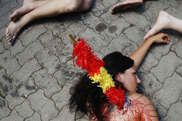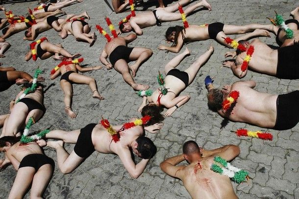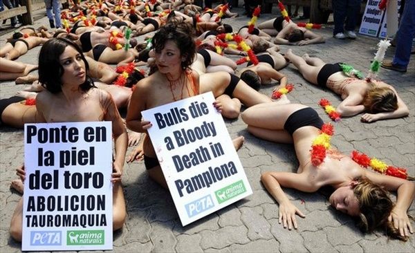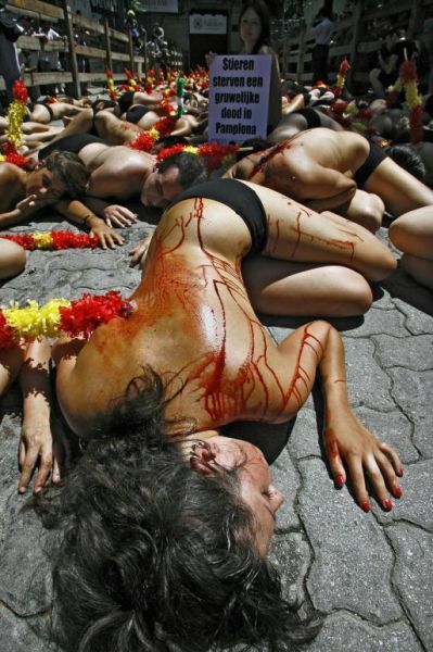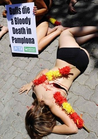 По уже сложившейся традиции за день до начала фестиваля «Санферминес» активисты легли вдоль улочек, по которым потом побегут быки. Их полуобнаженные тела были облиты красной краской, имитирующей кровь, а в руках они держали плакаты, призывающие к запрету корриды. Кроме этого, у некоторых защитников животных из спин торчали бандерильи (оружие, используемое в корриде).