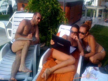 Прихватив свой менеджмент - директора Олега Вороновича, Ольги Ковтонюк, и личного пресс- агента Михаила Ясинского, - Могилевская устроилась на закрытом частном киевском пляже с ноутом на руках.