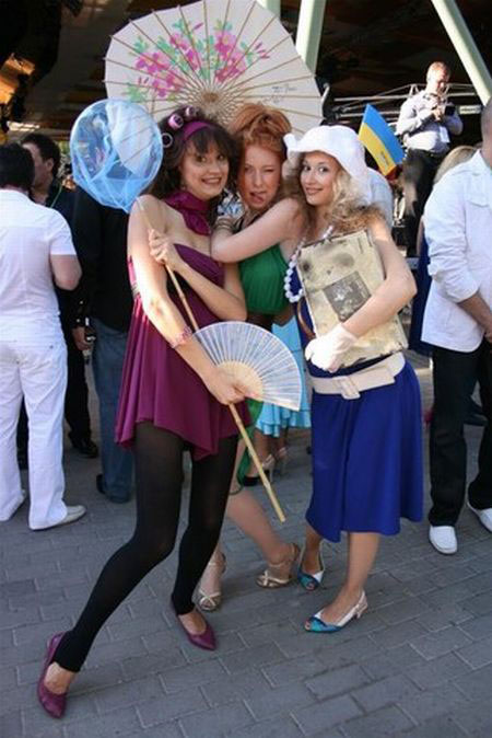 Шокировали публику и украинское трио "Заклепки", в прошлом - "Клипсы". Девушки нахлобучили себе на головы прически из бигуди, и набрали кучу аксессуаров: сачок, веер, японский зонтик, винтажный саквояж...