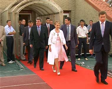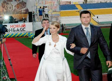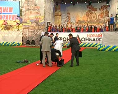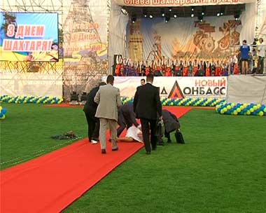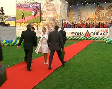 Это случилось в пятницу в Луганске, куда леди Ю. прибыла на День шахтера. Апофеозом вояжа должно было стать ее выступление на стадионе «Авангард». Тут Юлю ожидало несколько тысяч специально привезенных работяг. Где-то в середине праздничной программы ведущий огласил долгожданное выступление премьер-министра. Услышав приглашение, радостная Юля вместе с главой Минуглепрома Полтавцом направилась к сцене. Шла гостья по красной ковровой дорожке через футбольное поле. Вся в белом, на высоких каблуках. Сидящие на трибунах люди приветствовали своего премьера: кто радостным визгом, кто недовольным свистом. Счастливая и довольная Юля начала энергично махать руками, вертясь то направо, то налево. И тут в порыве эмоций с Юлей произошел принеприятнейший эпизод. Она упала на красную ковровую дорожку прямо вниз лицом. То ли сама споткнулась, то ли министр Полтавец нечаянно толкнул хрупкую премьершу, и она лишилась равновесия.