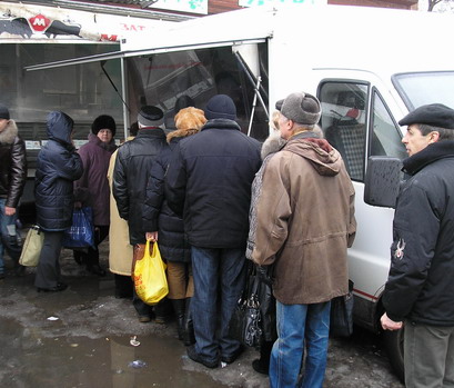 Еще один мужчина средних лет со знанием дела сравнивает украинскую и белорусскую продукцию : " У Вас водка лучше. Но колбаса вкуснее у нас. У нас там мясо, а у Вас одна соя".