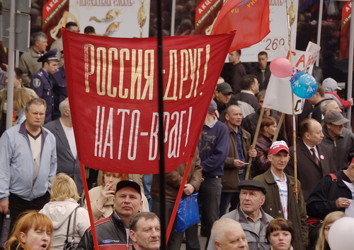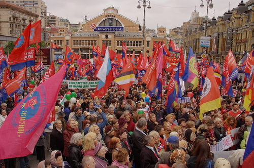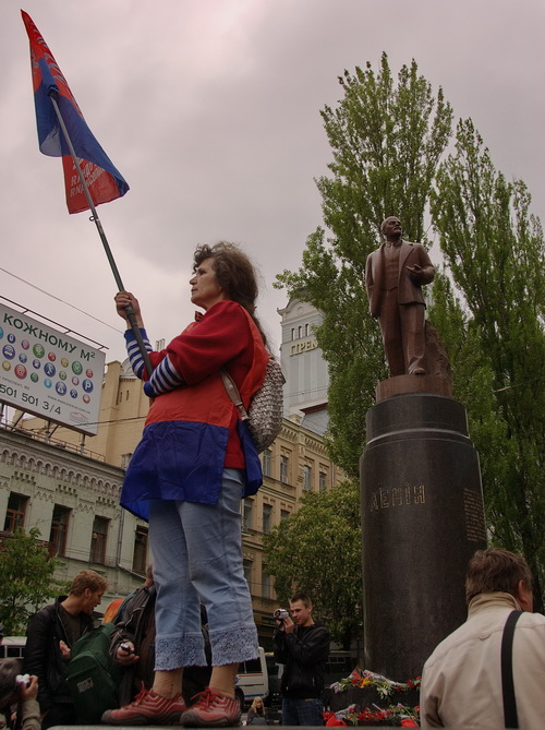 Вчера центральные улицы Киева с самого утра начали заполняться людьми с красными знаменами, портретами Ленина, плакатами «Мир, труд, май». Под аккомпанемент парадных песен колоны с разными политическими лозунгами, стартовавшие от станции метро Арсенальная, поочередно маршировали по Крещатику и возлагали цветы памятнику вождя Владимира Ильича на Бессарабской площади.