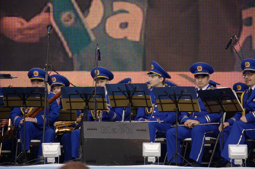 Напротив сцены с изображением серпа и молота расположились современные пролетарии. Федерация профсоюзов Украины под бело-голубыми знаменами собрали в основном представителей молодежи, которых развлекали прямой трансляцией на Первом Национальном телеканале и оркестром.