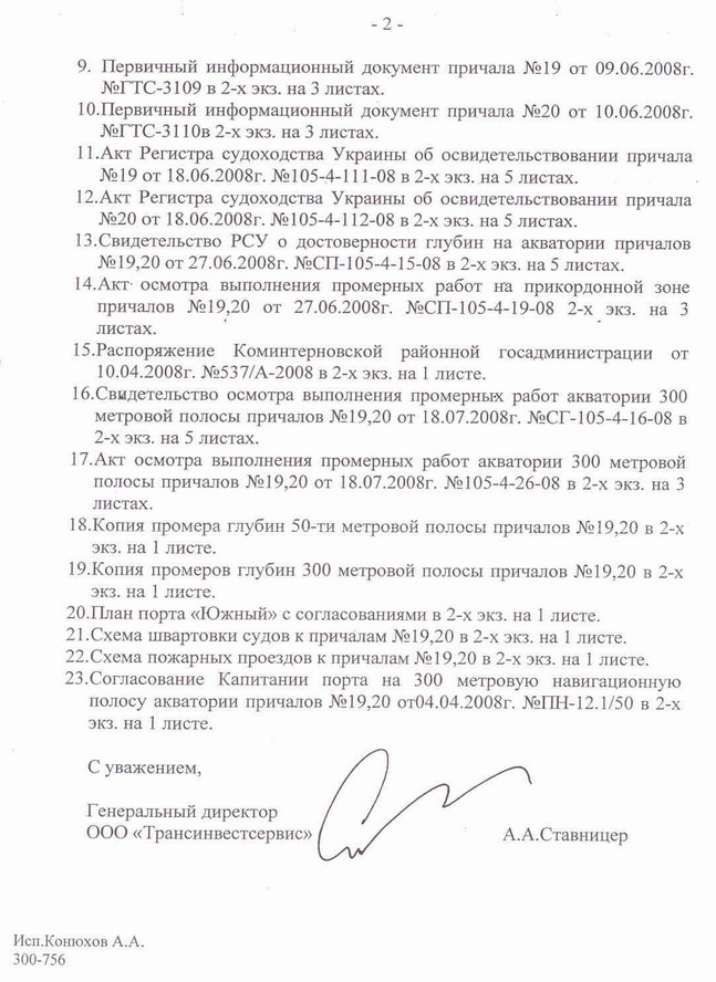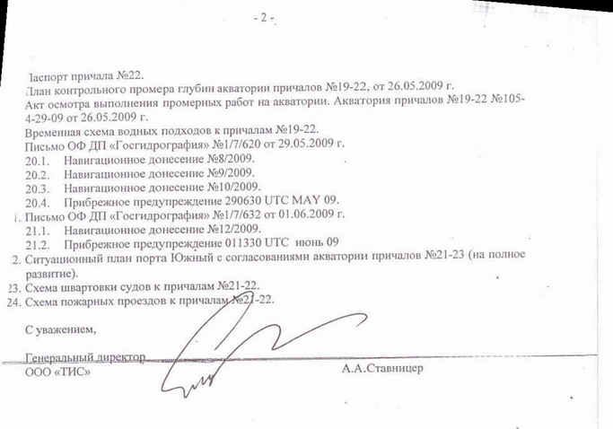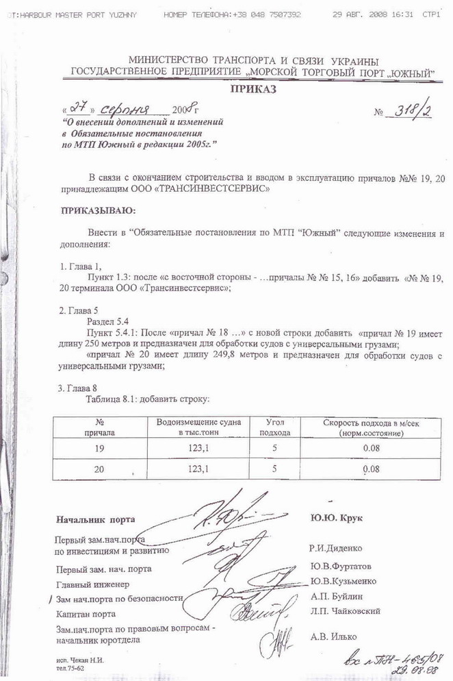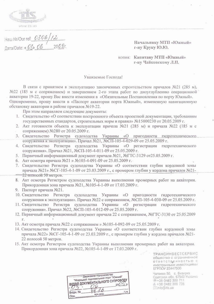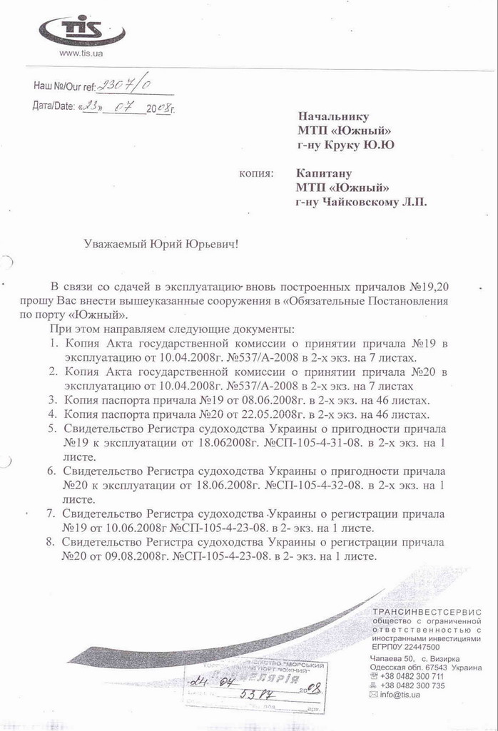 Как следует из этих документов, никакого «соглашения об отсутствии финансовых и материальных претензий» администрация порта ранее не требовала, и причалы №19-20 были включены в Свод на основании абсолютно идентичного комплекта документов. Кроме того, очевидно, что сам приказ о включении есть не более, чем формальность, не несущая никакой новой информации, которая бы отсутствовала на настоящий момент или которая бы действительно влияла на безопасность судоходства. Таким образом, Юрий Крук неправомерно обуславливает швартовку судов изданием своего приказа. Фактом является то, что причал построен, сдан в эксплуатацию и освидетельствован Регистром. Дальнейшие задержки со швартовкой судов являются грубым нарушением законодательства Украины и вымогательством со стороны начальника порта.